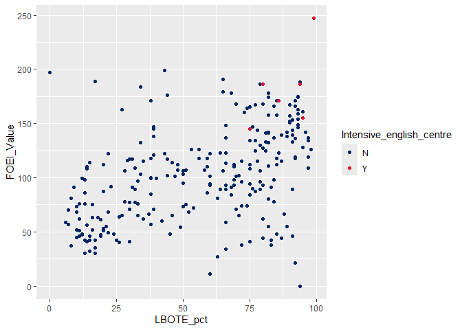 ggplot(aes(x = LBOTE_pct, y = FOEI_Value, colour = Intensive_english_centre)) +