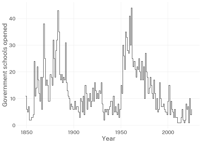 labs(x = "Year", y = "Government schools opened") +